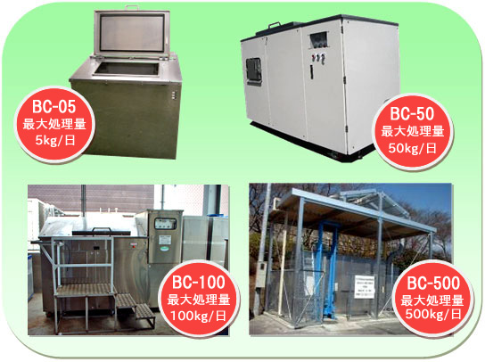 業務用生ごみ処理機 バイオクリーンは、最大処理量5kg/日から、500kg/日まで、計7機種をラインナップ。事業所の生ごみ処理を強力にサポートします。