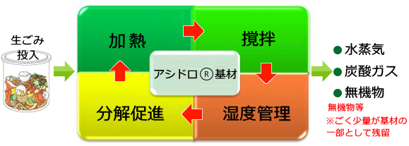 東北大学大学院工学研究科との長年の共同開発から生まれた、アシドロ®コンポスト分解方式を採用。分解菌(基材)の追加・交換にかかる費用を必要とせず、ランニングコスト低減に貢献します。
