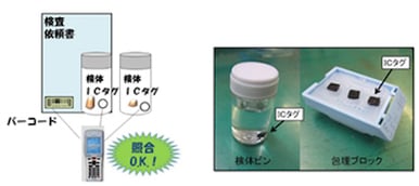 ICタグを検体に取付けて管理し、検査依頼書と照合を行うことで病理検査でのヒューマンエラーを未然に防ぎます。