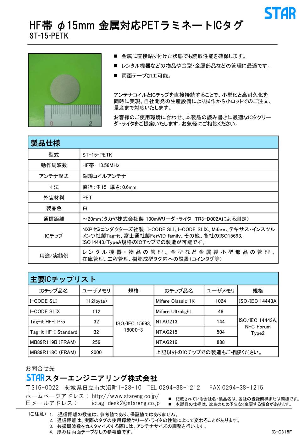 HF帯 φ15mm 金属対応PETラミネートICタグ